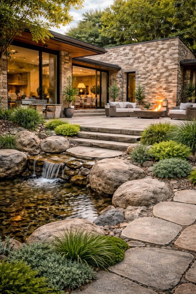 Projetos de paisagismo costumam combinar pedras, plantas e madeira para criar composições harmônicas e acolhedoras.